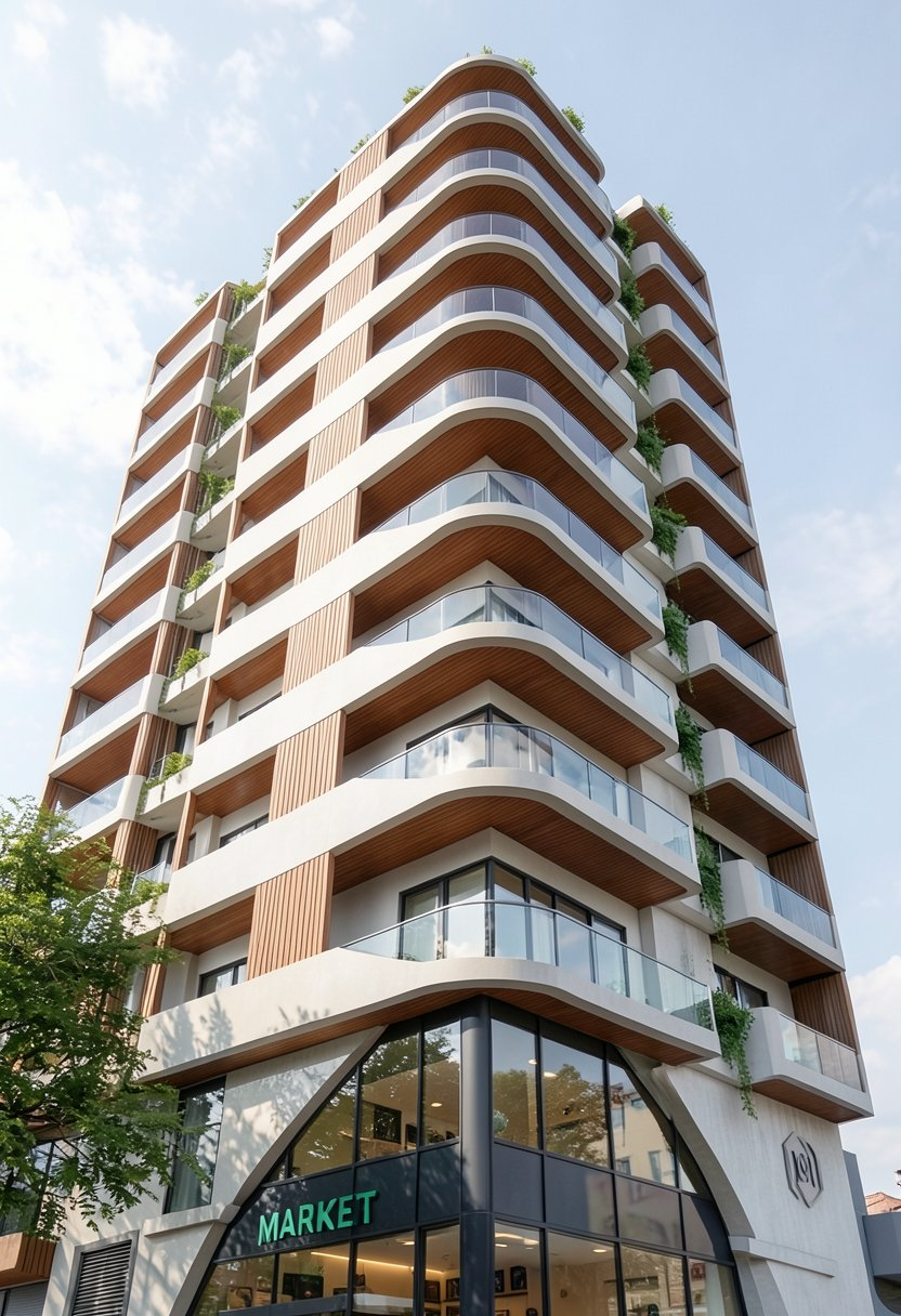 - Fachadas curvas con balcones integrados que optimizan la iluminación natural